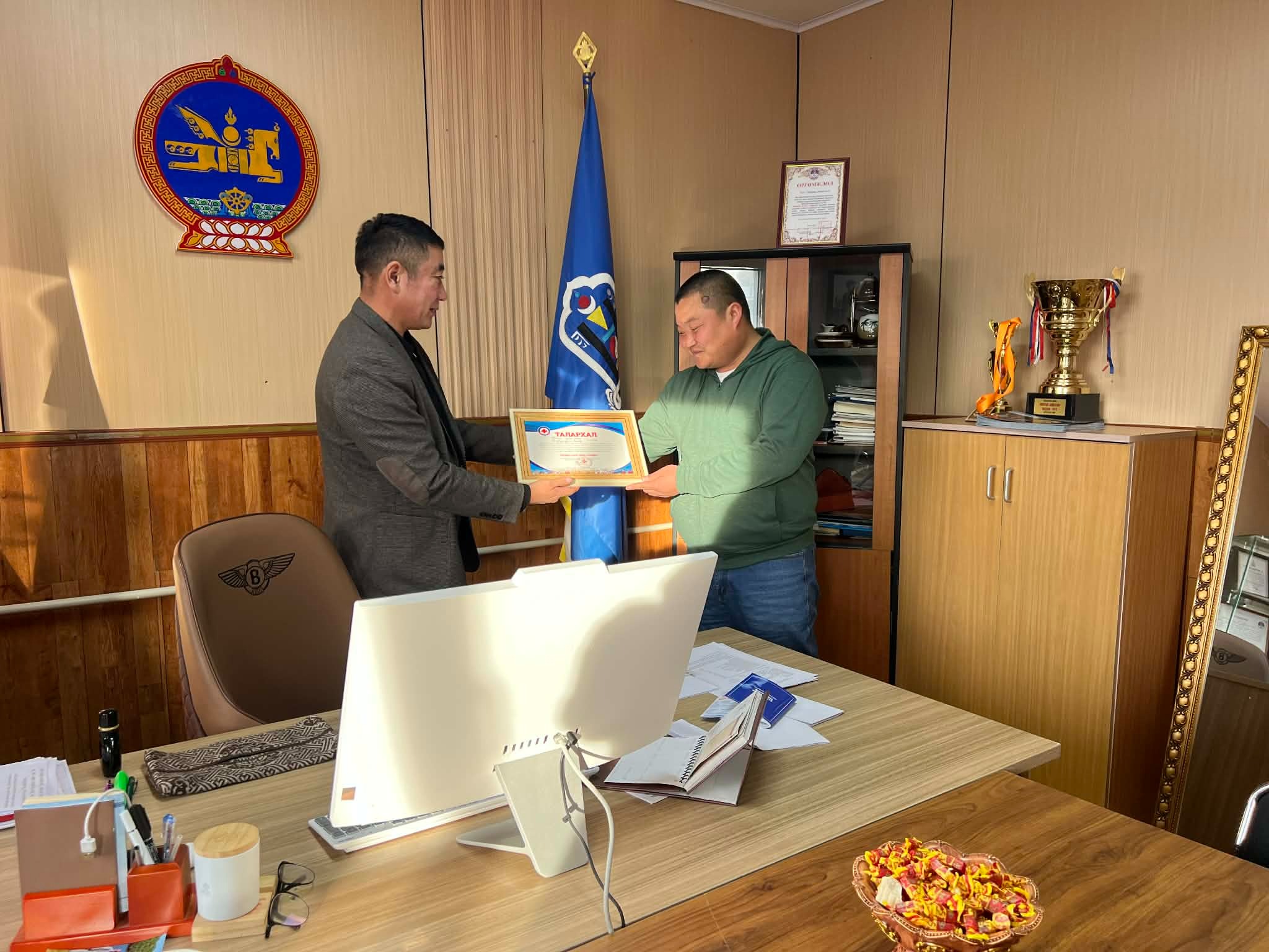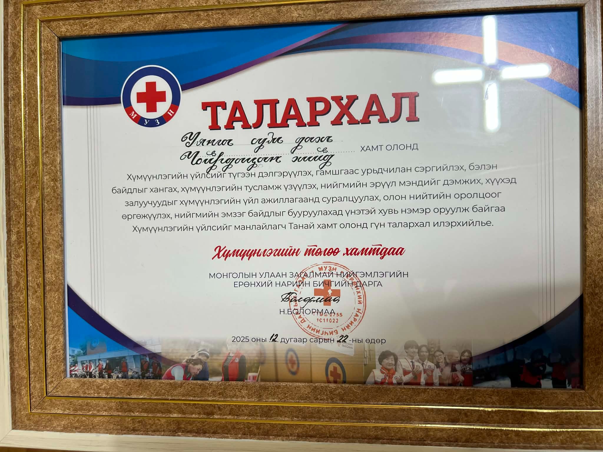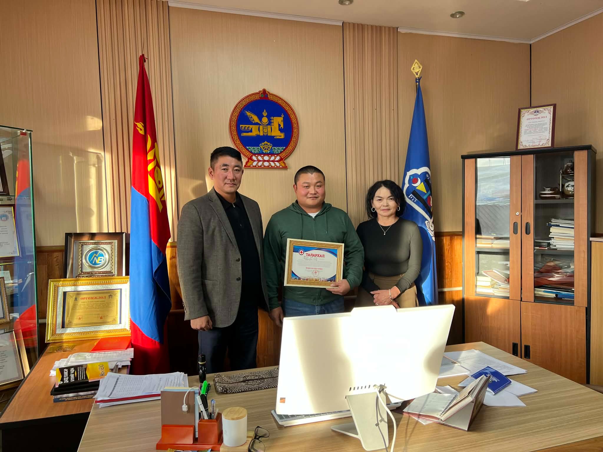 Жил бүр улаан загалмайн нийгэмлэгийн татвараа төлж, хүмүүнлэгийн үйлсэд нэгдэж байгаа сумын Чойрдацан хийдийн хамт олонд хүмүүнлэгийн үйлсийг түгээн дэлгэрүүлэх, гамшгаас урьдчилан сэргийлэх, бэлэн байдлыг хангах, хүмүүнлэгийн тусламж үзүүлэх, нийгмийн эрүүл мэндийг дэмжих, хүүхэд залуучуудыг хүмүүнлэгийн үйл ажиллагаанд суралцуулах, олон нийтийн оролцоог өргөжүүлэх, нийгмийн эмзэг байдлыг бууруулахад үнэтэй хувь нэмэр оруулсанд Монголын Улаан загалмайн Нийгэмлэгийн Ерөнхий нарийн бичгийн дарга Н.Болормаа гүн талархал илэрхийлж "Талархал" хадгалуулсныг сумын иргэдийн Төлөөлөгчдийн Хурлын дарга Т.Хүрэлбаатар гардуулан өглөө.